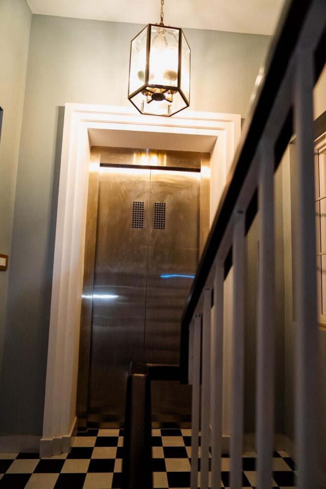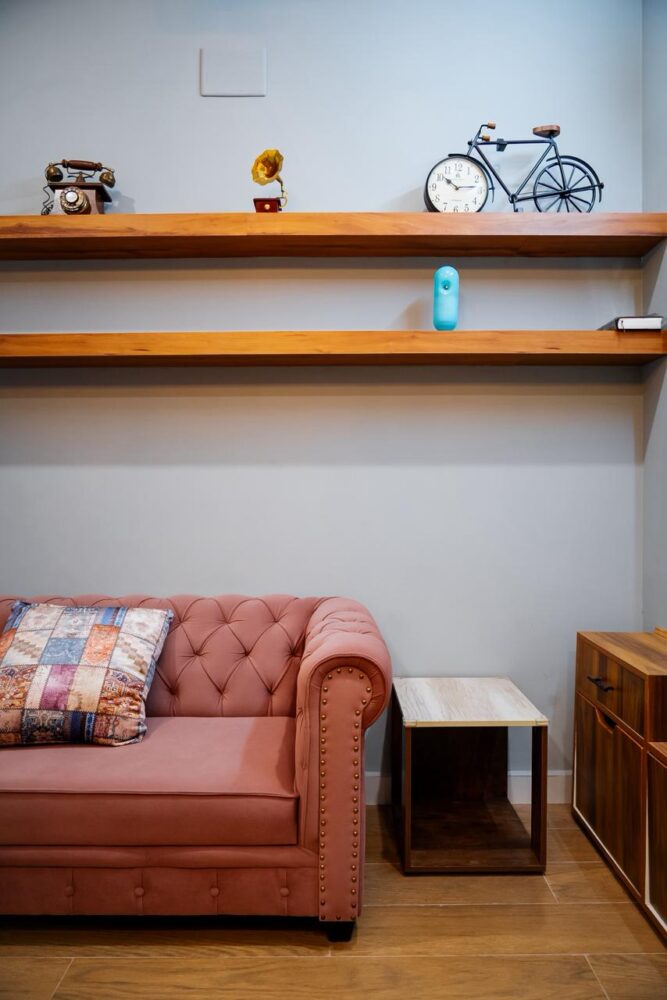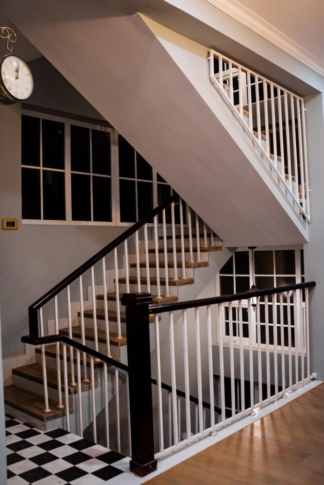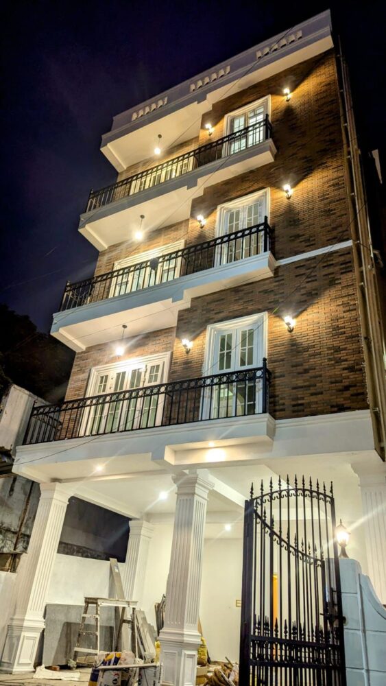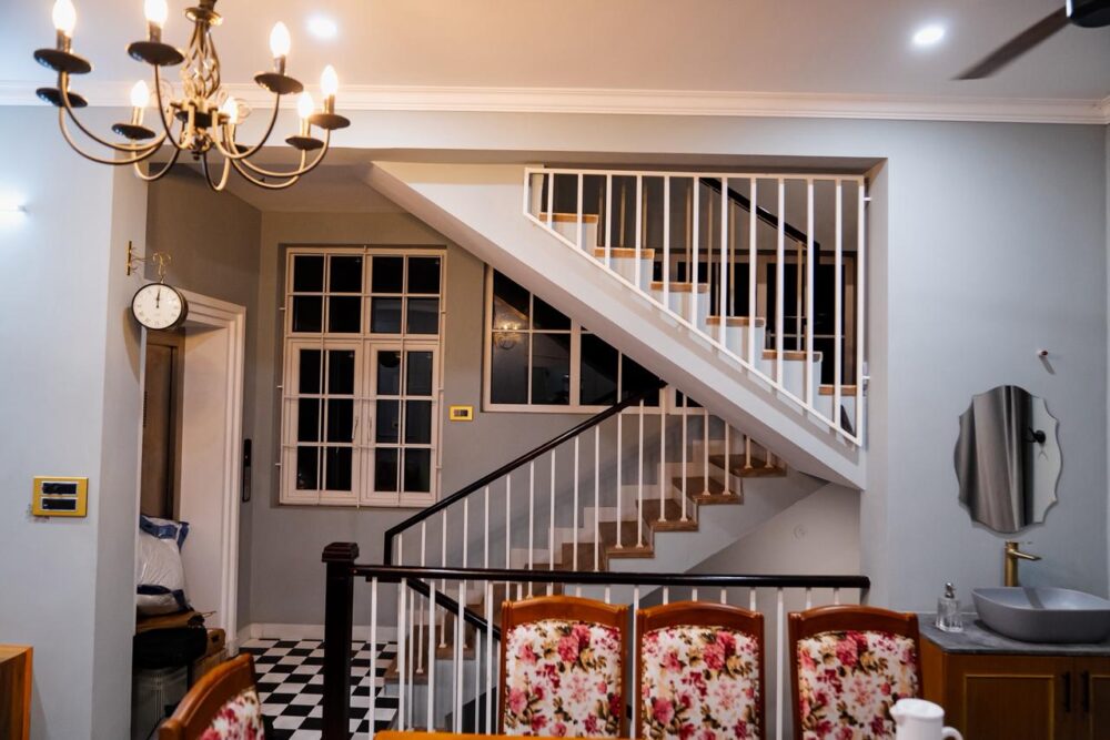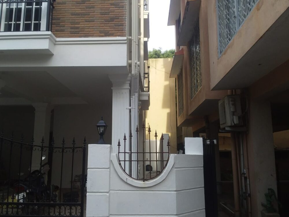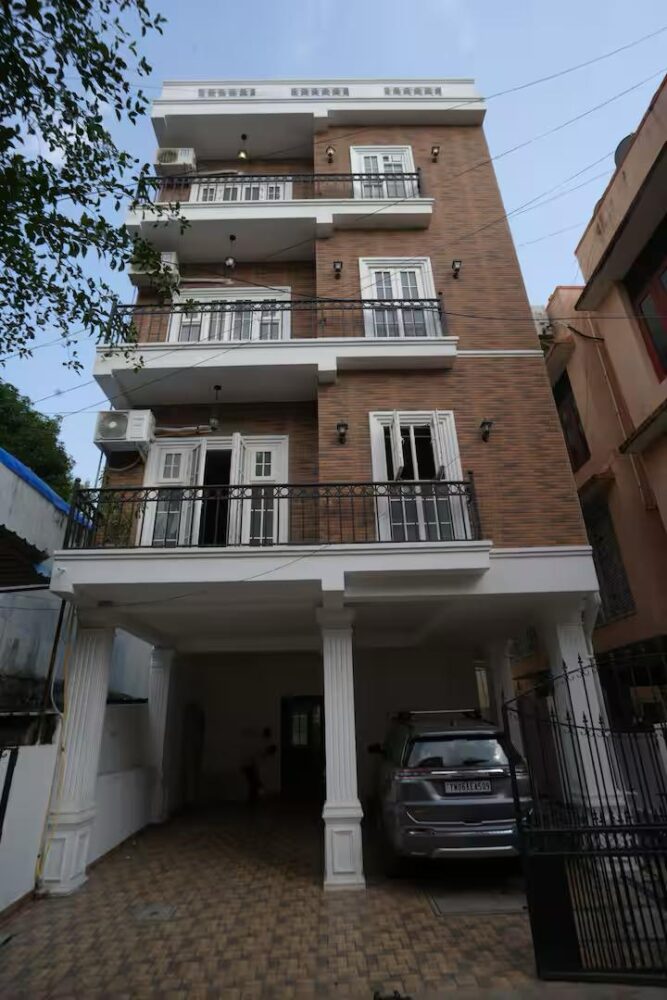 Located in the heart of Nungambakkam, the theme of this site is English with brick cladding and cornice work in elevation. A detailed selection of colours and materials enhance the theme with chequered black and white flooring in lift lobby, combination of glossy white and wood finish plank tiles in main areas and in staircase. Minimal handrail design that goes with the theme. Doors are made with wood and teakwood beading work to go with the theme, while the windows have Georgian Bars fixed at equal distance. Grooves in pillars with capital and base have band work in it. Main gate is made of mild steel and the compound wall with a semi-circular opening where the other half with mild steel.